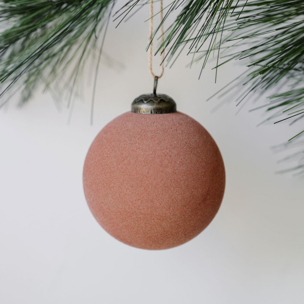 Our 3” Flocked Vintage Rose glass ornaments infuse your tree with a rich and velvety texture. Layer these rose colored ornaments within the tree to add depth, dimension and softness, allowing more traditional colored decorations to pop.