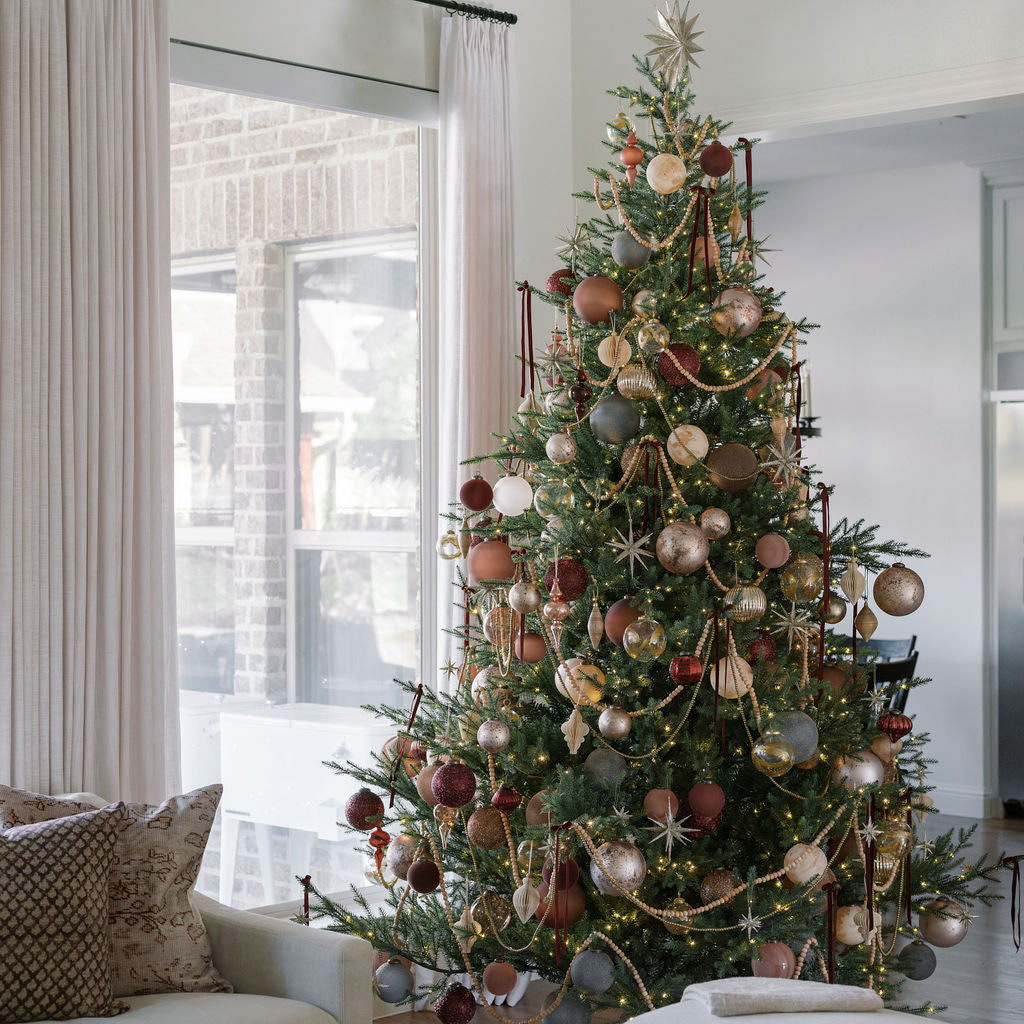 Our Handmade Mouthblown Glass Ornaments, featuring traditional timeless mercury glass. This set of 4 includes 4-inch diameter antique gold ornaments, each adorned with a natural jute hanger and bronze antique topper.