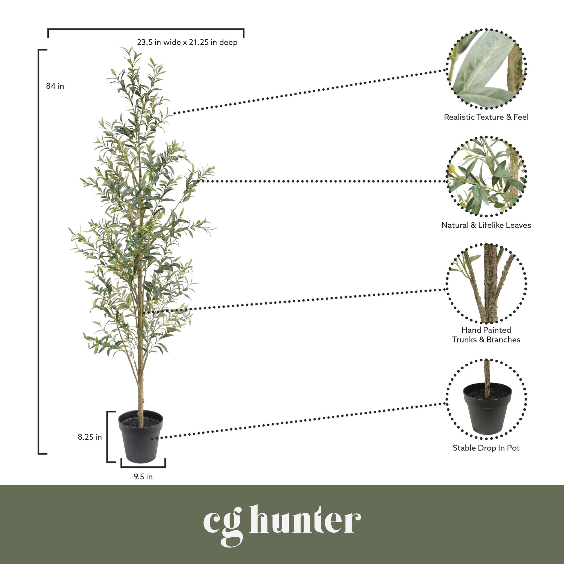 Perfect for compact settings, CG Hunter's 7' Slim Olive Tree brings the same lifelike allure as larger options. Elevate your smaller spaces with this maintenance-free masterpiece, blending the beauty of nature seamlessly with the convenience of modern design.