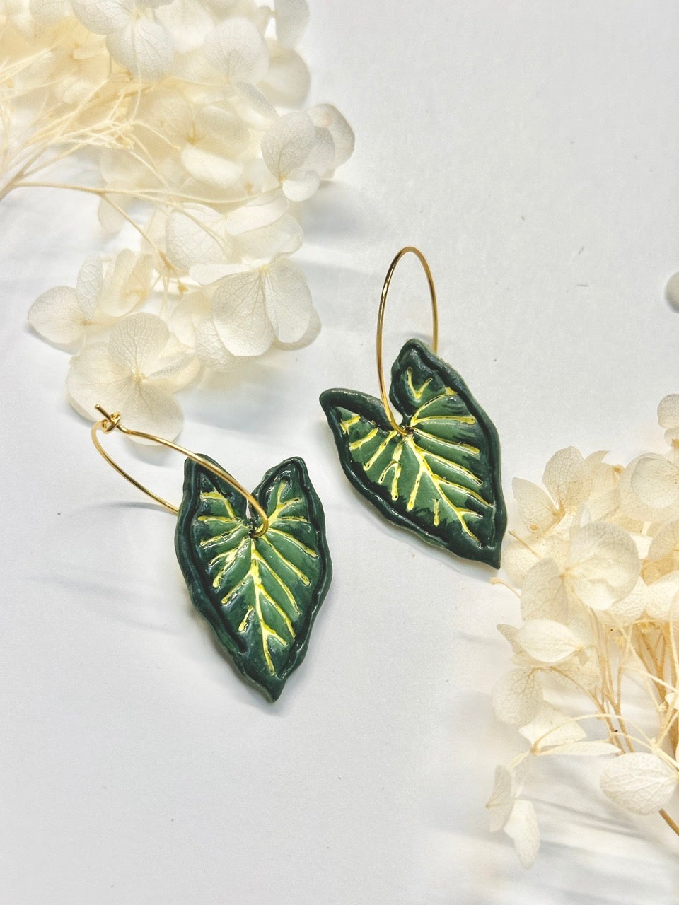 Lush and sophisticated—these Alocasia Frydek earrings are inspired by the elegant, velvety leaves of the Alocasia micholitziana ‘Frydek’. Each piece is hand-sculpted and painted to highlight the plant’s deep green tones and luminous light-green veins, creating a timeless botanical statement. Lightweight gold hoops add a modern touch, making these earrings perfect for everyday wear or special occasions.