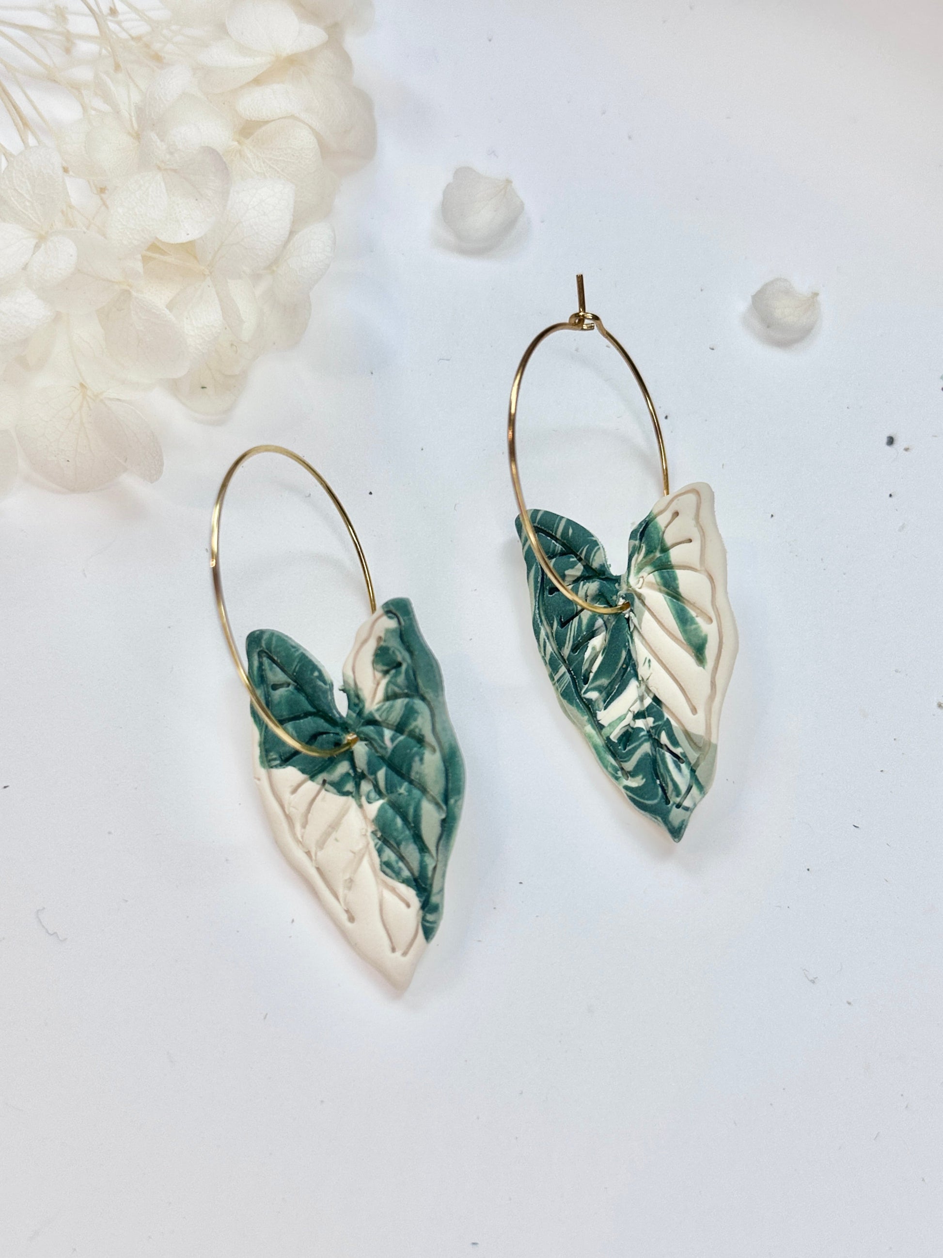 Elegant and rare—these Alocasia Frydek Variegated earrings are inspired by the lush, velvety leaves of the Alocasia micholitziana ‘Frydek’. Each piece is hand-sculpted and painted to highlight the plant’s beautiful contrast of deep green and creamy variegation. With graceful gold hoops and a lightweight feel, these earrings make a refined statement for plant lovers and artful jewelry collectors alike.