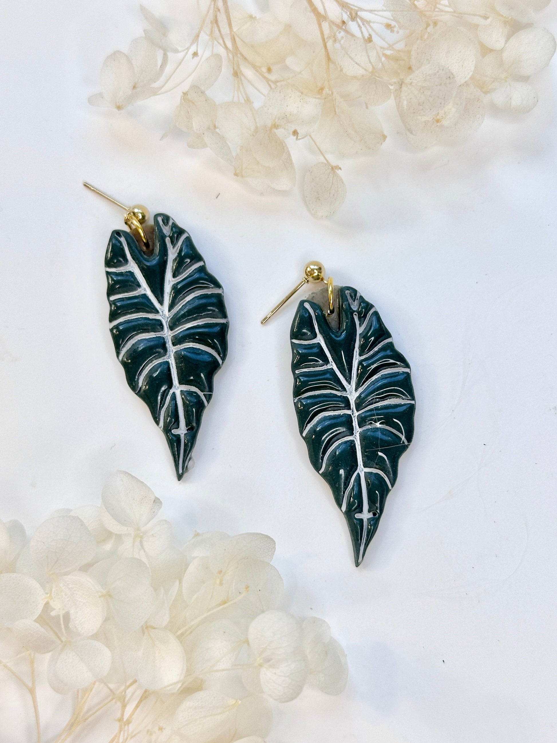 Bold and elegant—these Alocasia Polly earrings are inspired by the striking arrow-shaped leaves of the Alocasia amazonica, known for its deep green tones and dramatic white veins. Each piece is hand-sculpted and painted with intricate detail, capturing the essence of this tropical plant’s bold beauty. A statement accessory for plant lovers and anyone drawn to nature-inspired art.