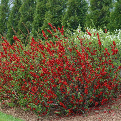 Chaenomeles 'Spitfire' - 'Spitfire Flowering Quince is a bold, early-spring bloomer that adds fiery color to the landscape when little else is flowering. Its vibrant, deep orange-red blossoms cover the bare branches before foliage appears, making it a standout shrub for borders, hedges, or naturalized areas. Tough, drought-tolerant once established, and resistant to deer, this low-maintenance deciduous shrub also attracts pollinators and makes an excellent cut flower.