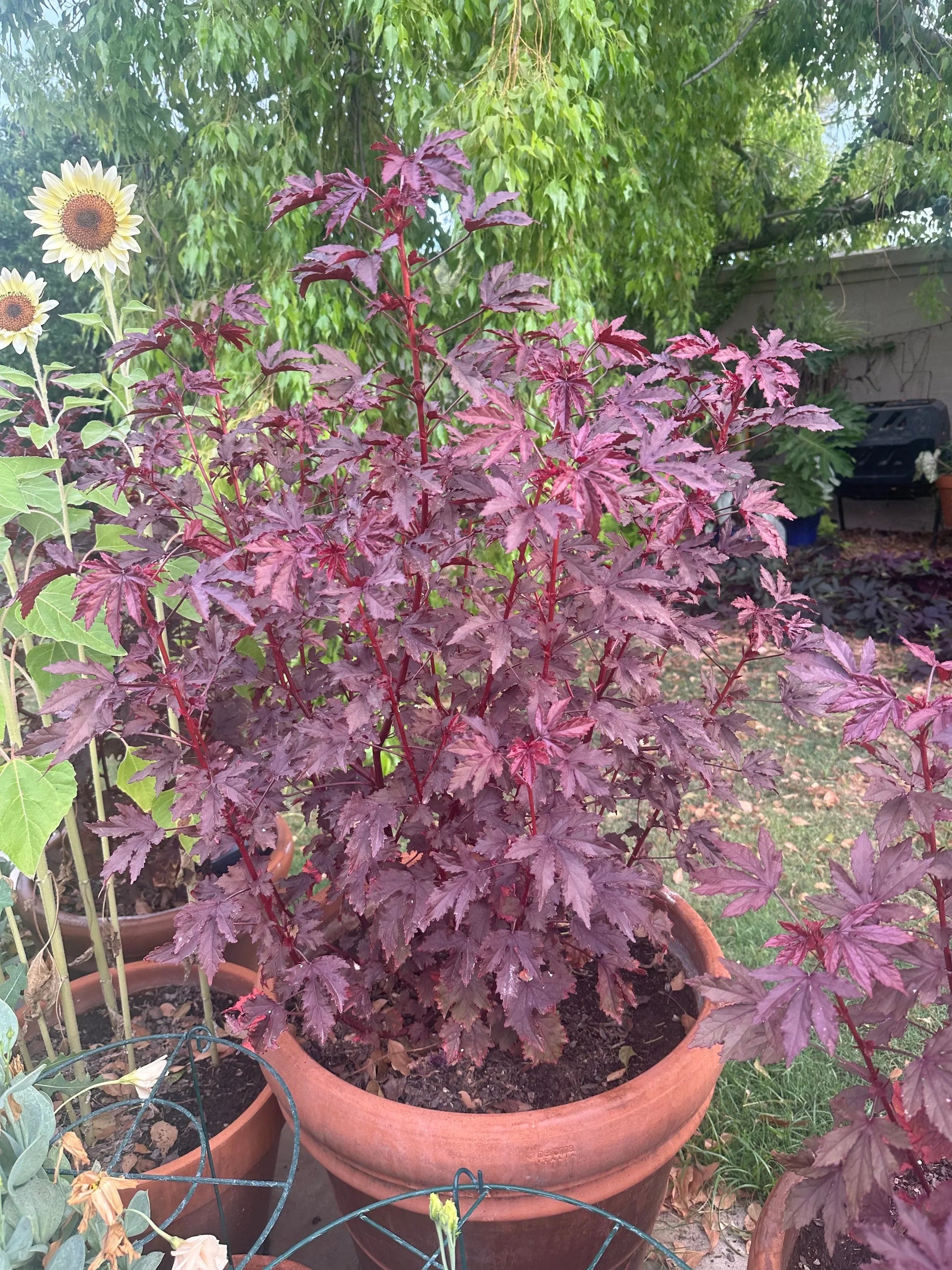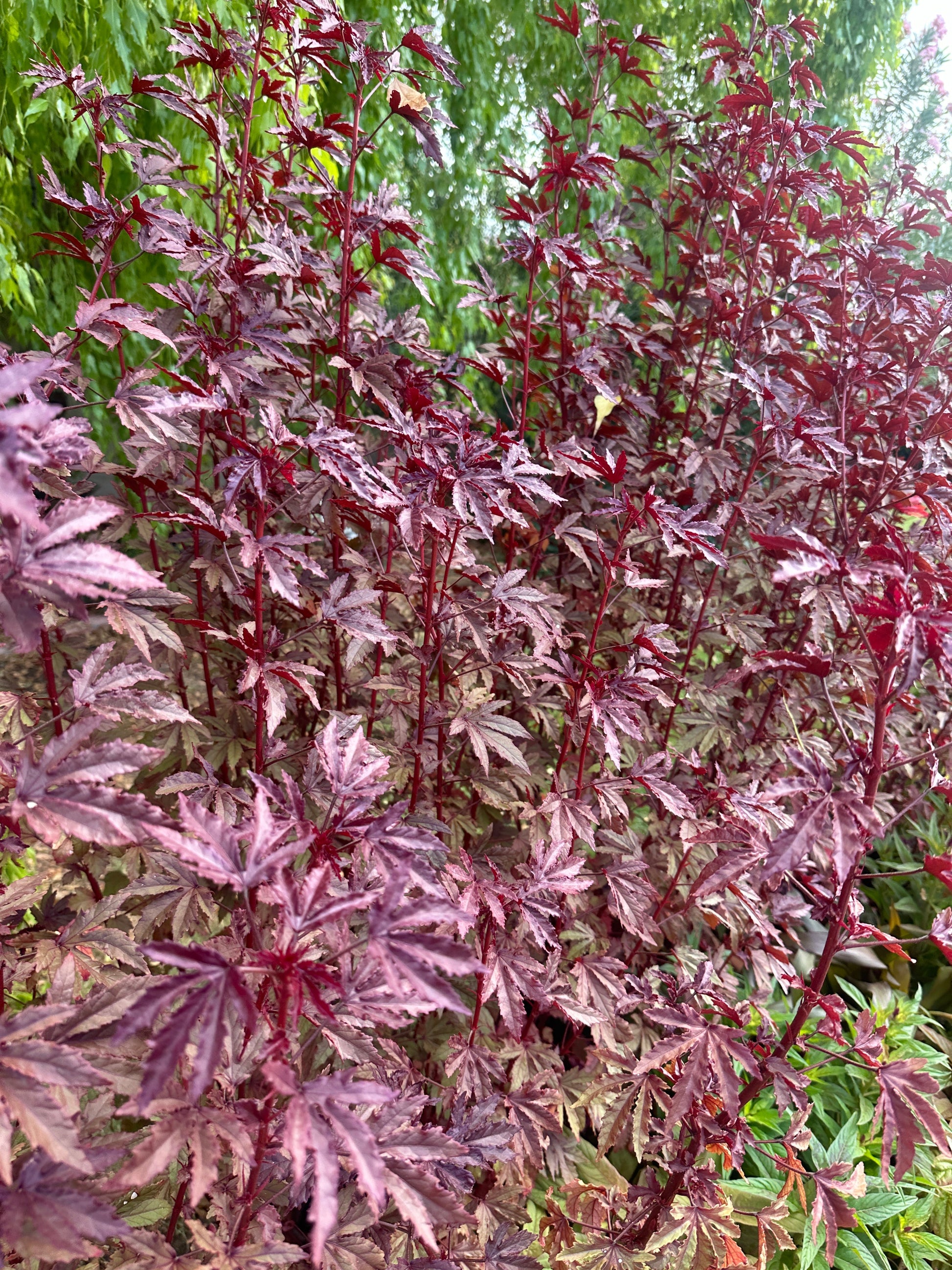 Mahogany splendors Hibiscus is a beautiful accent to any garden, especially in HOT climates. Their leaves resemble Japanese maples, offering a great mahogony color to the landscape.