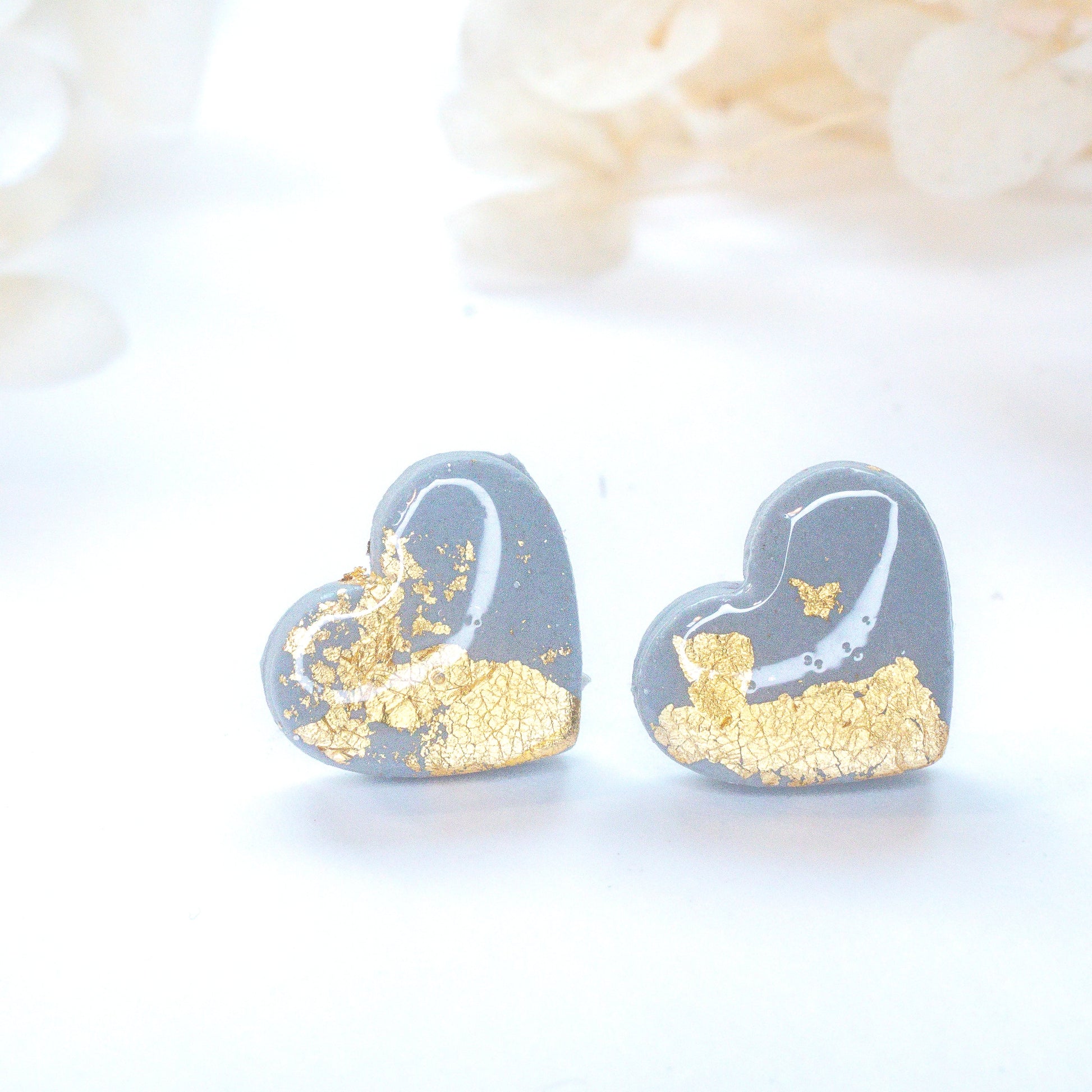 Cool-toned with a touch of shimmer, these grey heart studs bring a modern twist with beautiful flecks of gold foil for everyday elegance.
