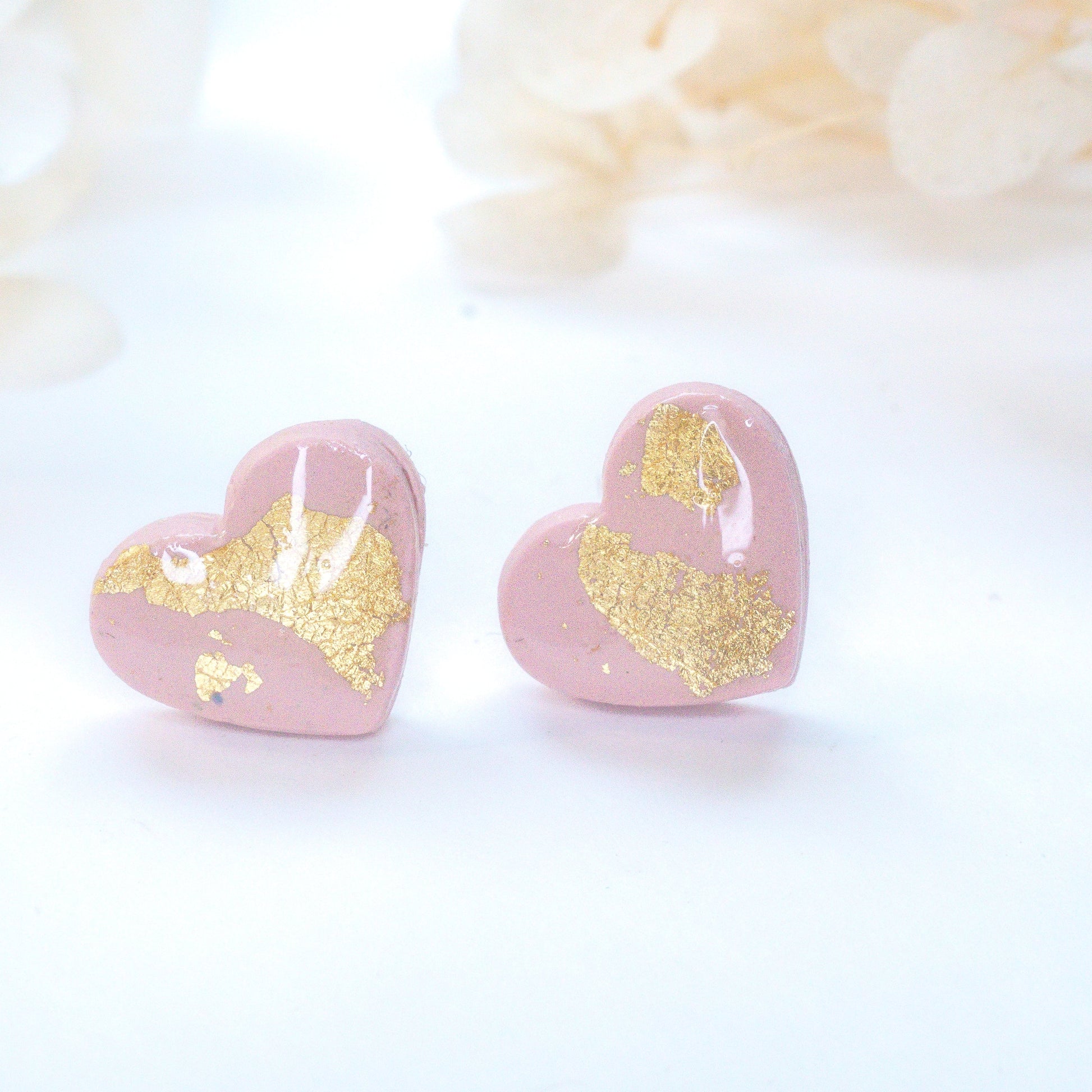 Sweet and charming, these blush pink heart studs are kissed with gold foil to add a playful sparkle to your everyday outfit.