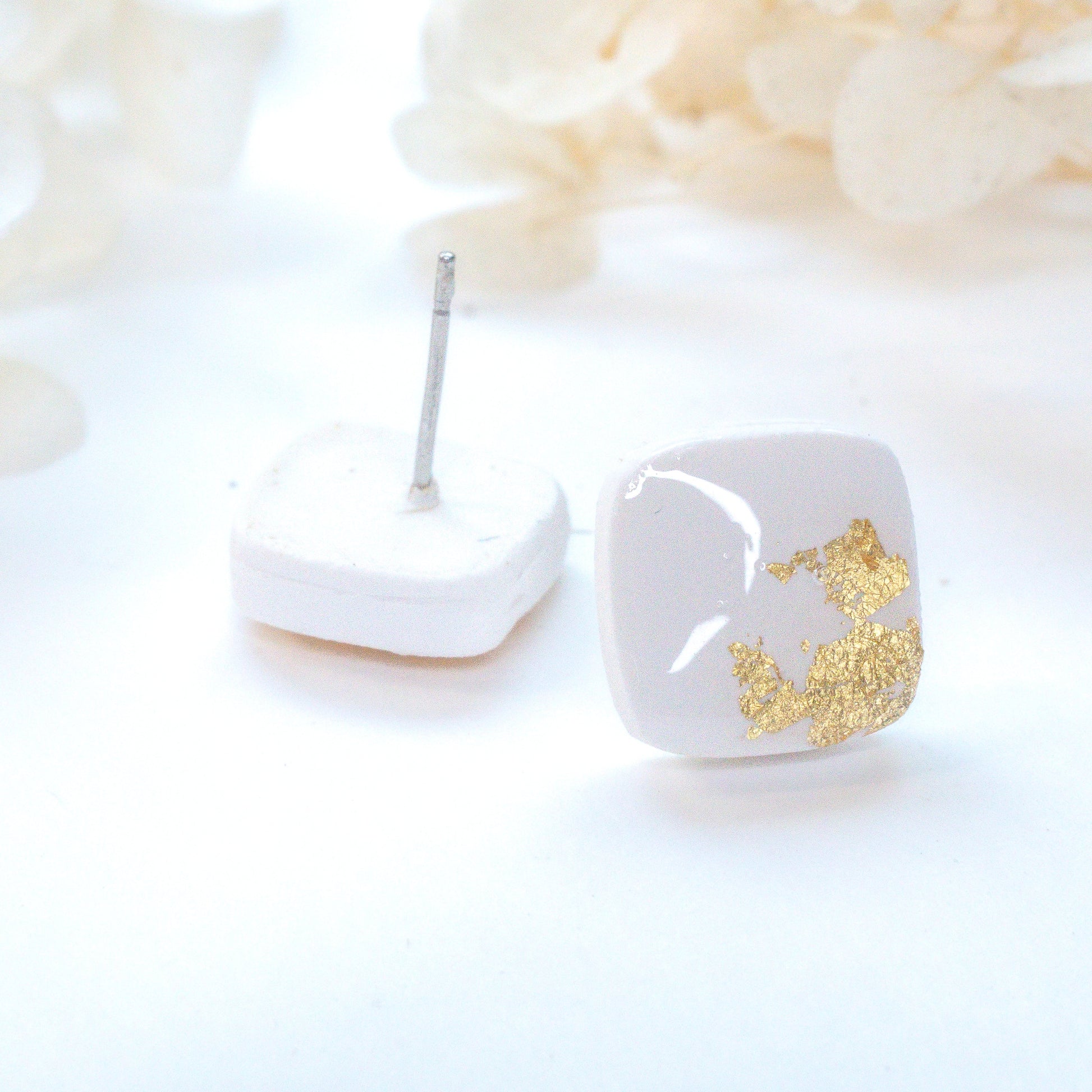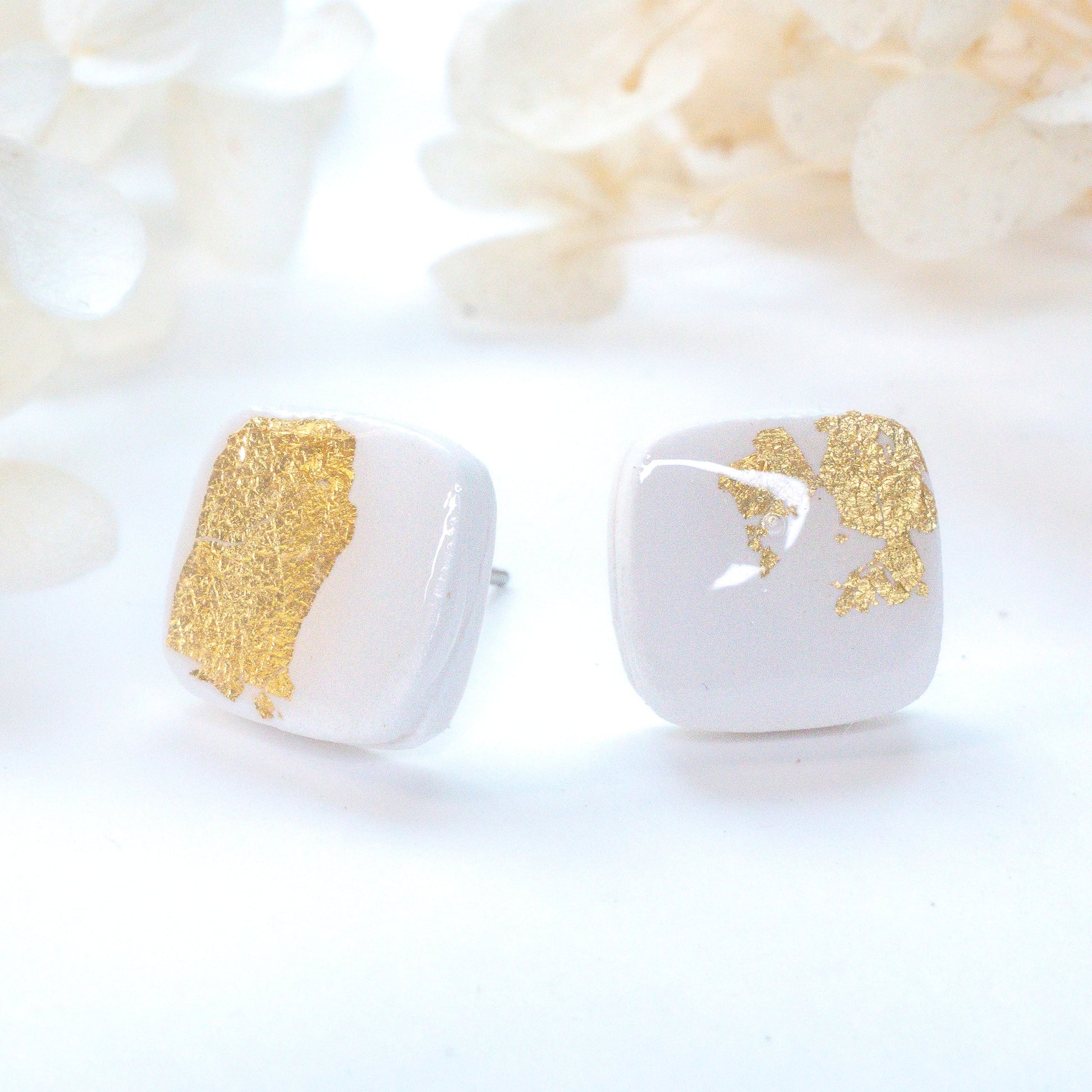 Elegant in their simplicity, these square studs feature a clean white base with a subtle splash of gold foil—perfect for adding a hint of shine to your everyday look.
