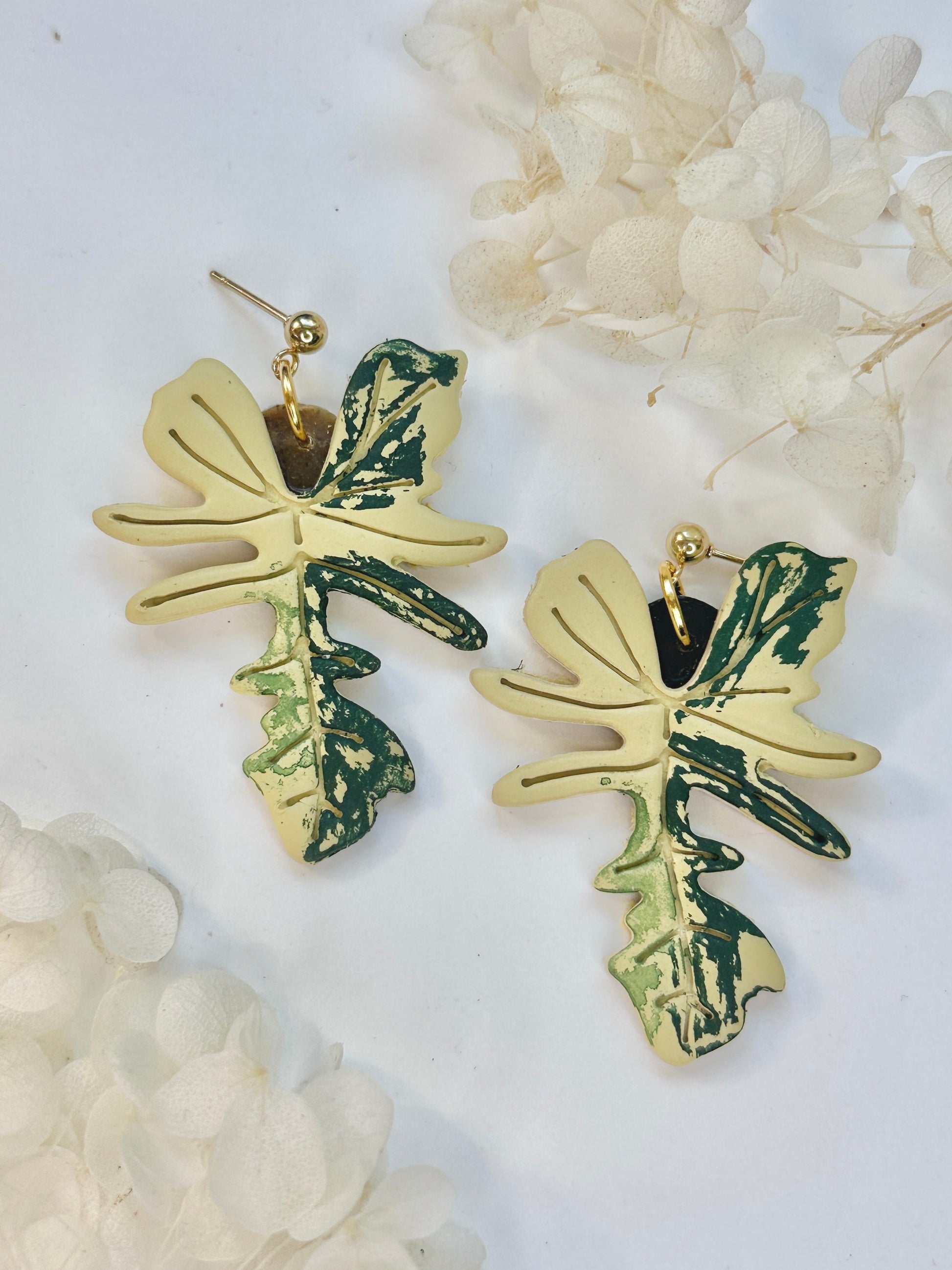 Artful and bold—these Philodendron Florida Beauty earrings capture the rare variegation and sculptural leaves of this tropical favorite. Each piece is carefully hand-sculpted and painted to highlight the natural mix of creamy yellow and deep green tones found in the real foliage. The result is a botanical statement that feels elegant, modern, and full of personality.