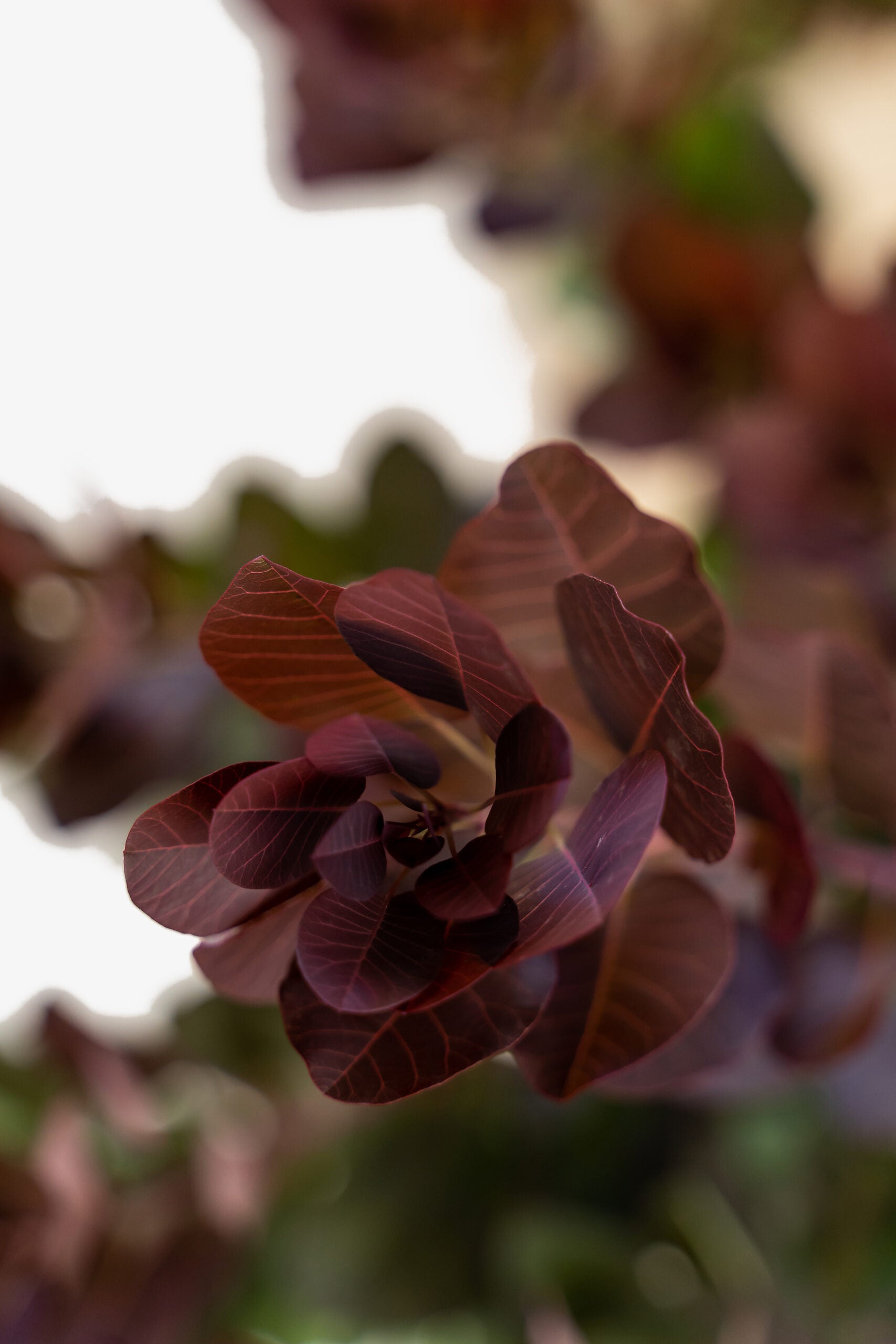 Foliage emerges deep purple in spring, holds its color through summer, and turns fiery red-orange in fall. In midsummer, wispy flower clusters rise above the leaves, creating a smoky, cloud-like effect.