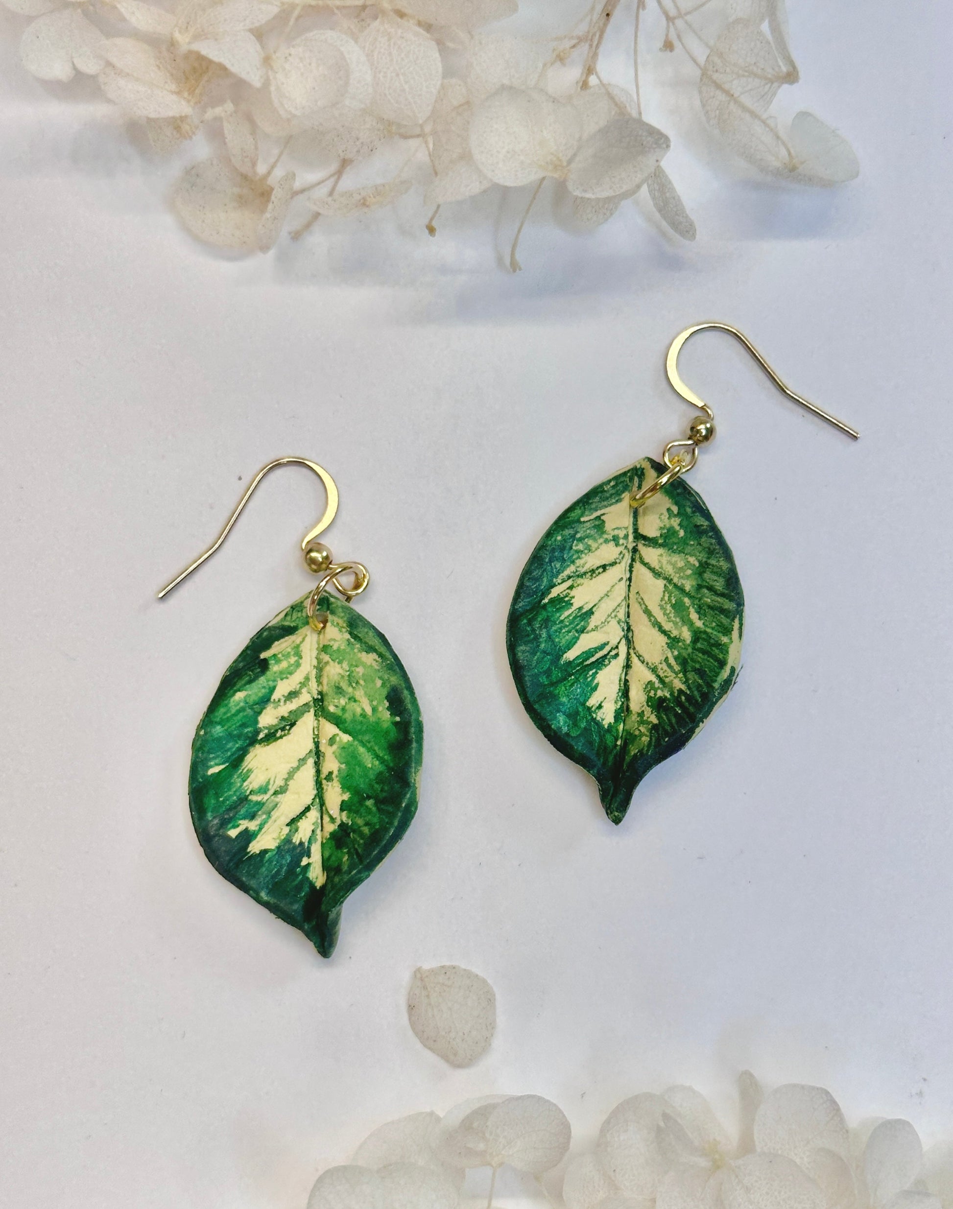 Soft and serene—these Hoya Variegated earrings are inspired by the delicate foliage of the Hoya carnosa variegata. Each leaf is hand-sculpted and painted to reflect the plant’s signature creamy edges and lush green center, creating a graceful accessory that celebrates nature’s gentle beauty. Perfect for plant lovers and minimalist jewelry enthusiasts.